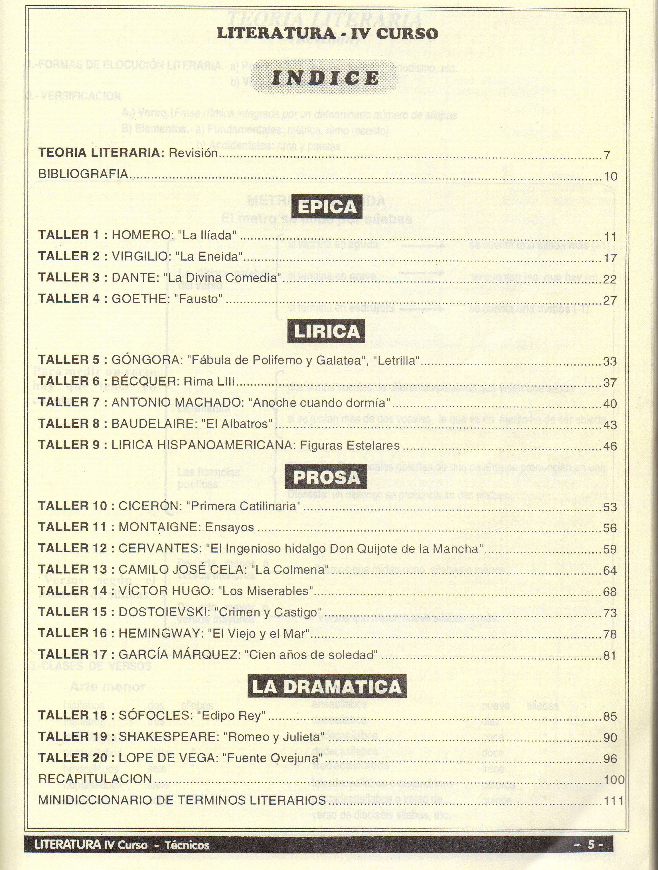 TÃtulo : Literatura, Colegios Técnicos cuarto curso. Talleres Tipo de documento: texto impreso Autores: Manuel Freire, Autor Editorial: Riobamba : Edipcentro Número de páginas: 108 p. Il.: il., fotografÃas Dimensiones: 27x20.5 cm Nota general: Incluye: Indice, Bibliografía, Mini diccionario de términos literarios. Idioma : Español Clasificación: Literatura Palabras clave: TEXTO DE LITERATURA, TALLERES, SILABAS, FIGURAS O RECURSOS LITERARIOS, Clasificación: 800.7 FRE Nota de contenido: Teoría literaria.-- Epica: Homero, Virgilio, Dante, Goethe.-- Lírica: Góngora, Bécquer, Antonio Machado, Baudelaire, Lírica hispanoamericana.-- Prosa: Cicerón, Montaigne, Cervantes, Camilo José Cela, Victor Hugo, Dostoievski, Hemingway, García Márquez.-- Dramática: Sófocles, Shakespeare, Lope de Vega.-- Minidiccionario de términos literarios. Link: https://catalogo.bibliolatino.com/uemo/opac_css/index.php?lvl=notice_display&id= Reserva