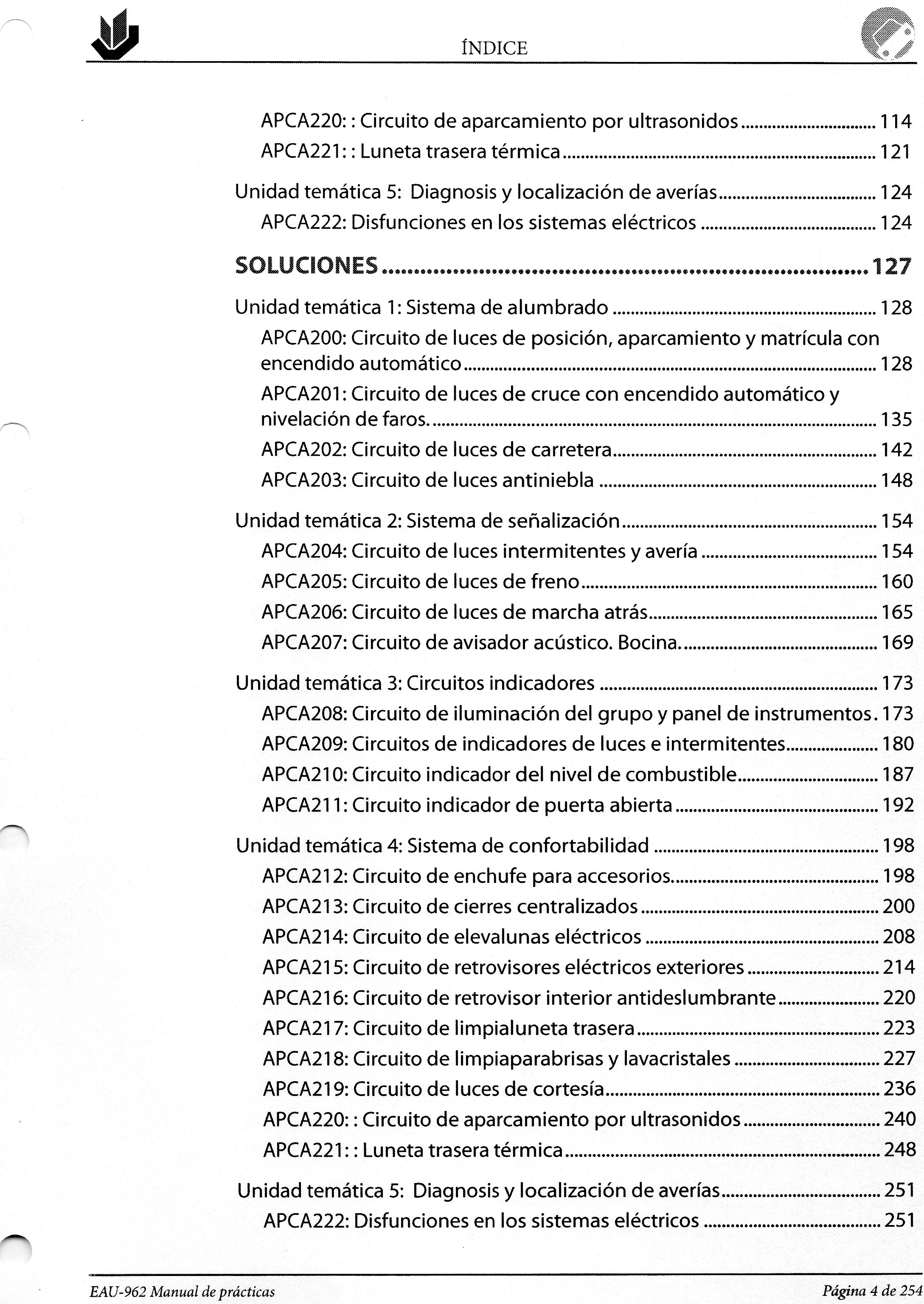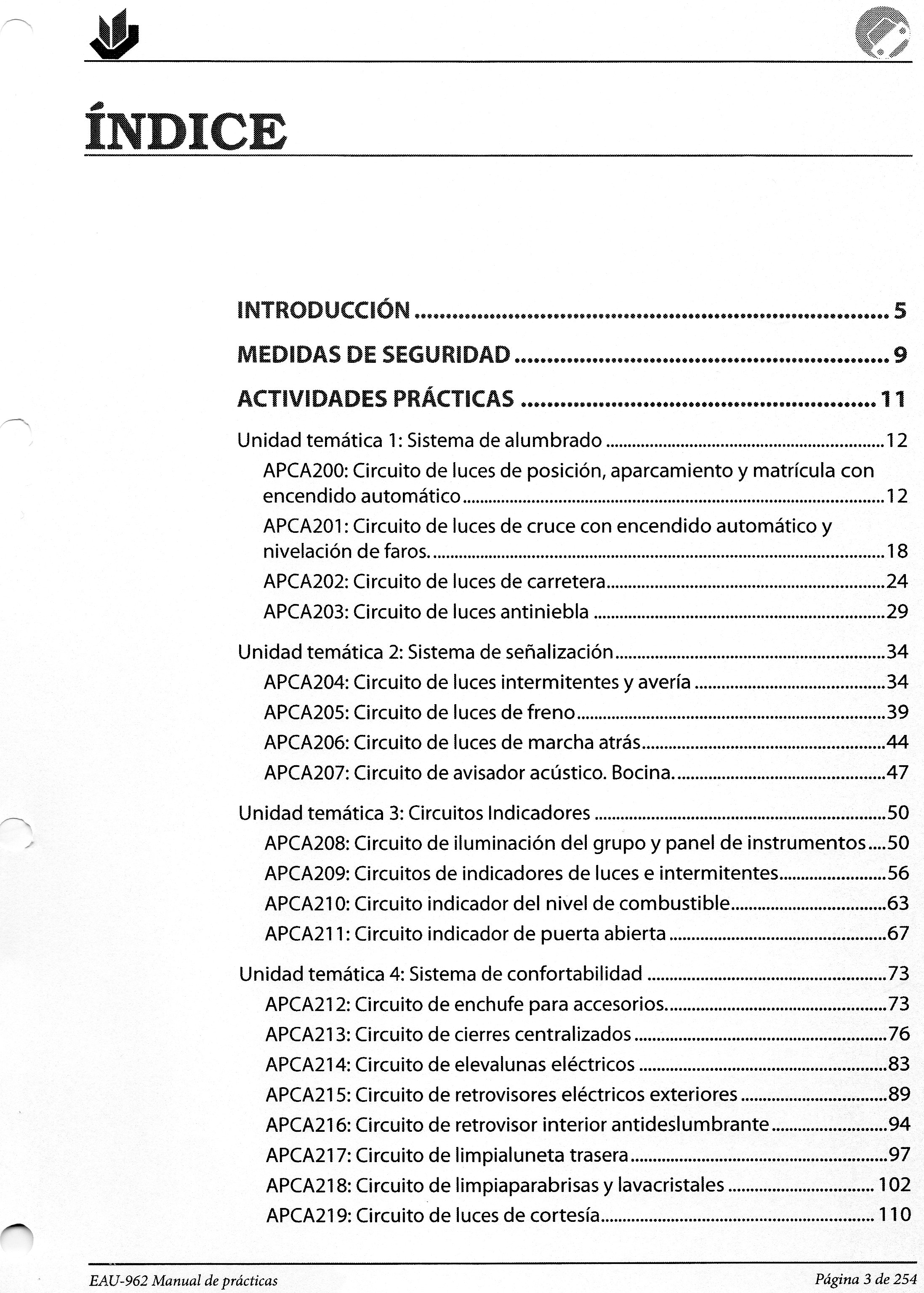 TÃtulo : EAU-962.- Circuitos eléctricos auxiliares. Manual de prácticas. CARPETA Tipo de documento: texto impreso Editorial: España : Alecop S.Coop Fecha de publicación: 2000 Número de páginas: 254 p. Il.: il. Dimensiones: 31x27 cm Nota general: Incluye: Indice. Clasificación: Diseño, materiales, construcción. Palabras clave: ELECTRICIDAD DEL AUTOMOVIL, AUTOMOTRIZ, CIRCUITOS, DIAGRAMAS, EDUCACION, MAQUETAS. Clasificación: 629.23 Diseño materiales construcción Nota de contenido: Medidas de seguridad.- Sistema de alumbrado.- Sistema de señalización.- Circuitos indicadores.- Confortabilidad.- Soluciones.- Diagnosis y localización de averías. Link: https://catalogo.bibliolatino.com/uemo/opac_css/index.php?lvl=notice_display&id= Reserva