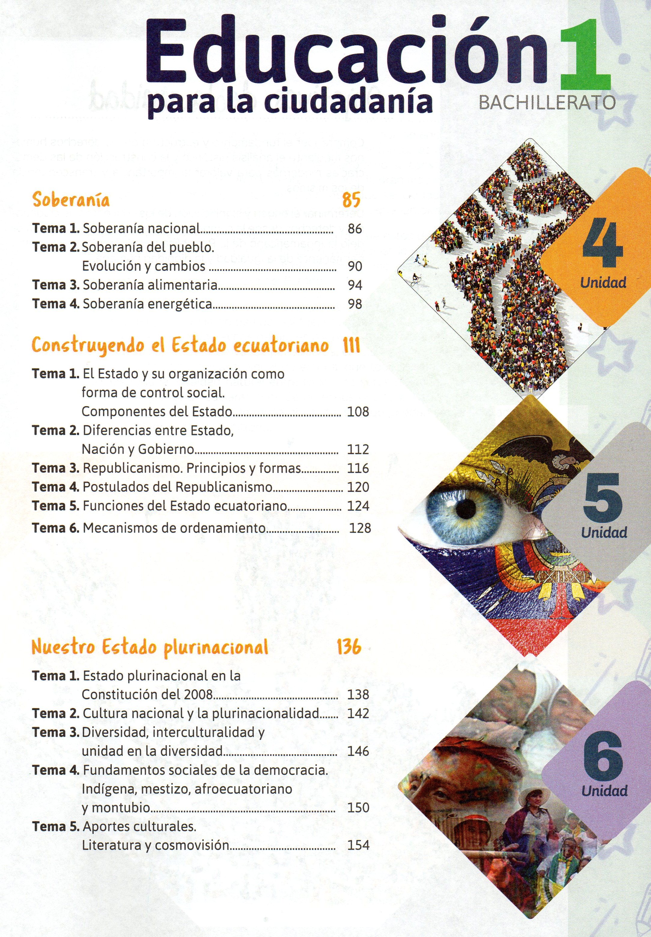 TÃtulo : Educación para la CiudadanÃa. 1 BGU Tipo de documento: texto impreso Autores: Andrea Buenaño, Autor Mención de edición: 1a ed Editorial: Educate+ Fecha de publicación: 2017 Número de páginas: 161 p Il.: il. Dimensiones: 28x20.5cm ISBN/ISSN/DL: 978-9942-30-727-9 Nota general: Incluye: Indice, Actividades, Evaluación, Bibliografía. Idioma : Español Clasificación: Educación Palabras clave: EDUCACION, DEMOCRACIA, ESTADO, ECUADOR, CIUDADANIA, CONSTITUCION. Clasificación: 370.115 Educación para la responsabilidad social Nota de contenido: Construcción de la ciudadanía.-- Vivamos la democracia.-- Asambleas constituyentes.-- Soberanía.--Construyendo el Estado ecuatoriano.-- Nuestro Estado plurinacional. Link: https://catalogo.bibliolatino.com/uemo/opac_css/index.php?lvl=notice_display&id= Reserva