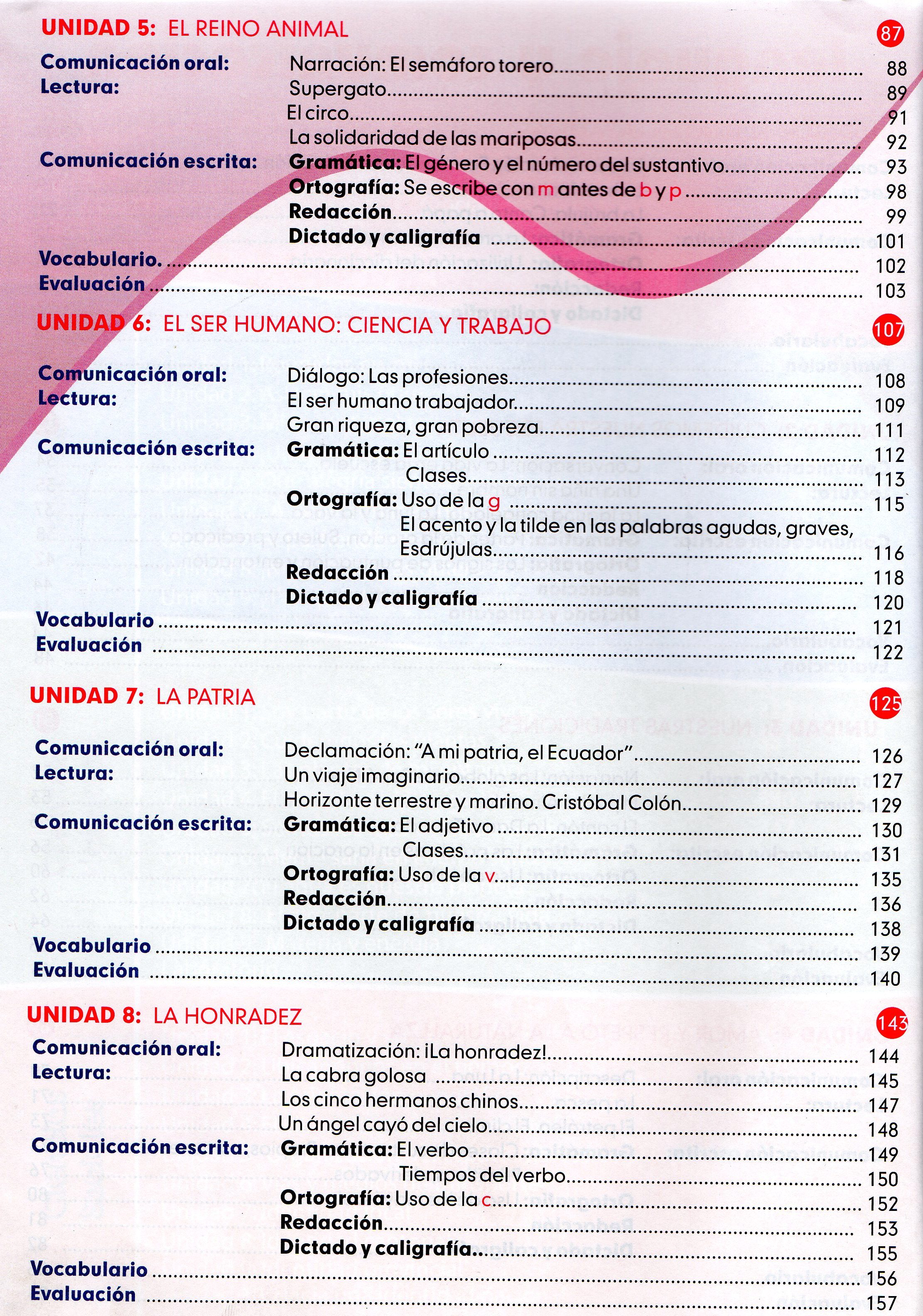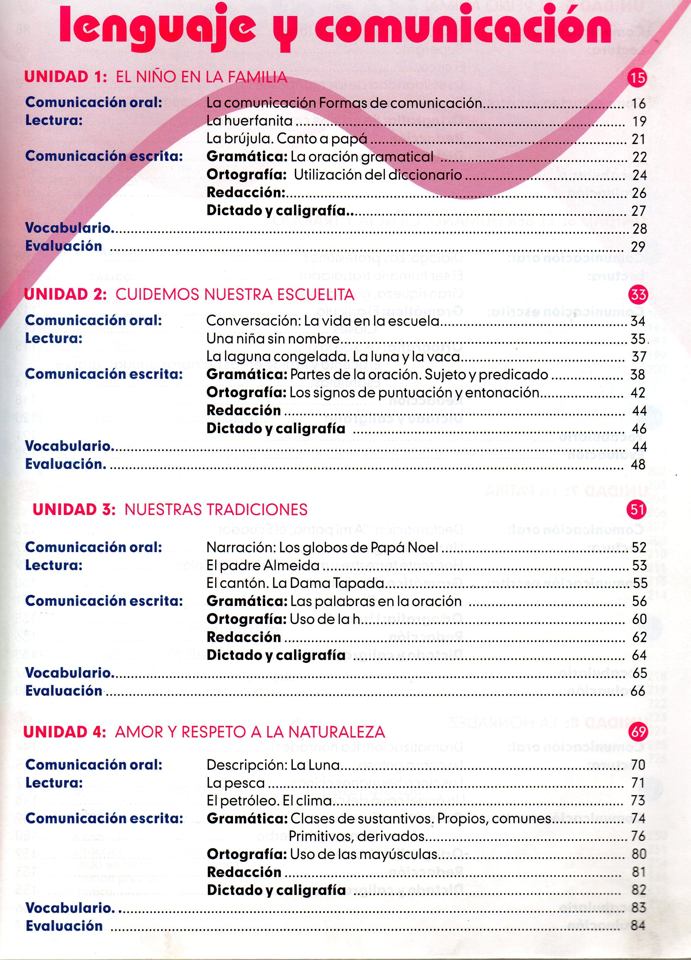 TÃtulo : Aula y vida 4to. Educacon básica. Libro del Docente Tipo de documento: texto impreso Editorial: Riobamba : Edipcentro Número de páginas: 498 p Il.: il., fotografÃas Dimensiones: 27.5x21 cm Nota general: Incluye: Indice, Símbolos patrios, Himno Nacional, Actividades, Evaluación, Idioma : Español Clasificación: Educación Primaria Palabras clave: EDUCACION, LENGUAJE, MATEMATICA, CIENCIAS NATURALES, CIENCIAS SOCIALES. Clasificación: 372.24 Educación, Niveles específicos de escuela primaria Nota de contenido: Formas de comunicación.-- Conversación.-- Narración.-- Descripción.-- El reino animal.-- El ser humano: ciencia y trabajo.-- Diálogo.-- La patria.-- Declamación.-- La honradez.-- Dramatización.-- Sistema de funciones.-- Sistema numérico.-- Sistema geométrico y de medida.- Sistema numérico.-- Seres vivos.-- Las plantas.-- Los animales.-- Los mamíferos.-- El ser humano.-- Partes del cuerpo humano.-- Los órganos de los sentidos.-- El agua.-- El aire.-- Materia y energía.-- El espacio.-- Orientación en el tiempo.-- Orientación geográfica.-- El clima.-- Factores que modifican el clima.-- División político-administrativa del Ecuador.-- Vías y medios de transporte.-- Identidad familiar.-- Cantón.-- Regiones.-- Identidad nacional. Link: https://catalogo.bibliolatino.com/uemo/opac_css/index.php?lvl=notice_display&id= Reserva