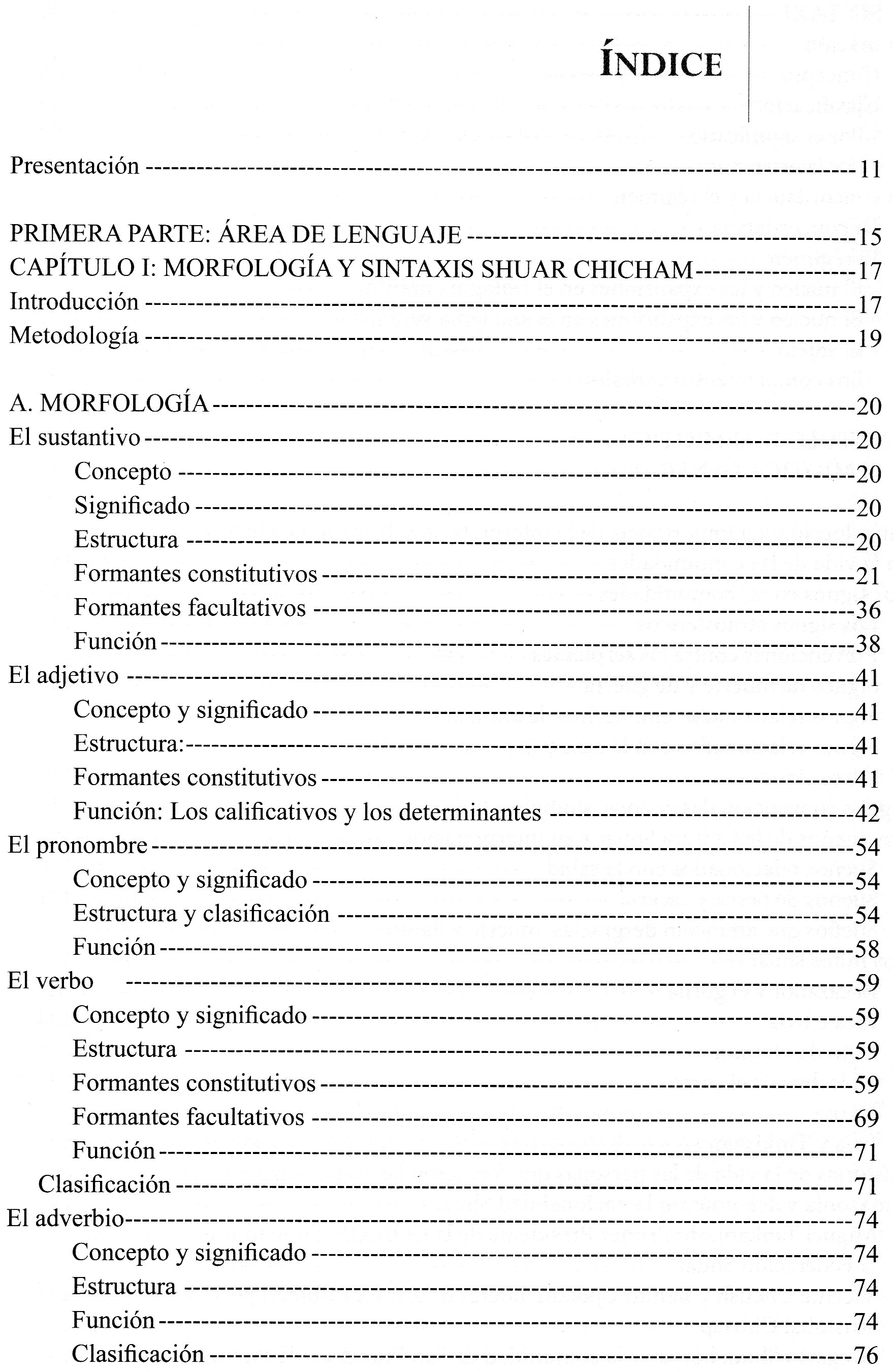 TÃtulo : AUJMATSATAI YATSUCHI : Manual de aprendizaje del idioma Shuar Tipo de documento: texto impreso Autores: Aijiu Juank, Autor Mención de edición: 5a ed. Editorial: VicarÃa de Pastoral shuar y achuar Fecha de publicación: 1997 Número de páginas: 127 p. Il.: il. Dimensiones: 21 x 16 cm Nota general: Incluye: Indice, Presentación, Chicham Ikiutai. Clasificación: Lengua nativas sudamericanas Palabras clave: Lenguas, shuar. Clasificación: 498.372 Lengua Shuar Nota de contenido: Encuentro.-- Visita.-- Parentesco.-- Cocina y comida.-- Cuerpo Humano.-- Remedios.-- El agua.-- De paseo.-- Al trabajo.-- En el campo.-- En la plaza.-- Primer nivel (lectura y escritura), (matemática moderna), (Estudio del entorno natural y social).-- Primer Nivel (Juego organizado).-- Mensaje de vida.-- Aujmatma. Link: https://catalogo.bibliolatino.com/uemo/opac_css/index.php?lvl=notice_display&id= Reserva