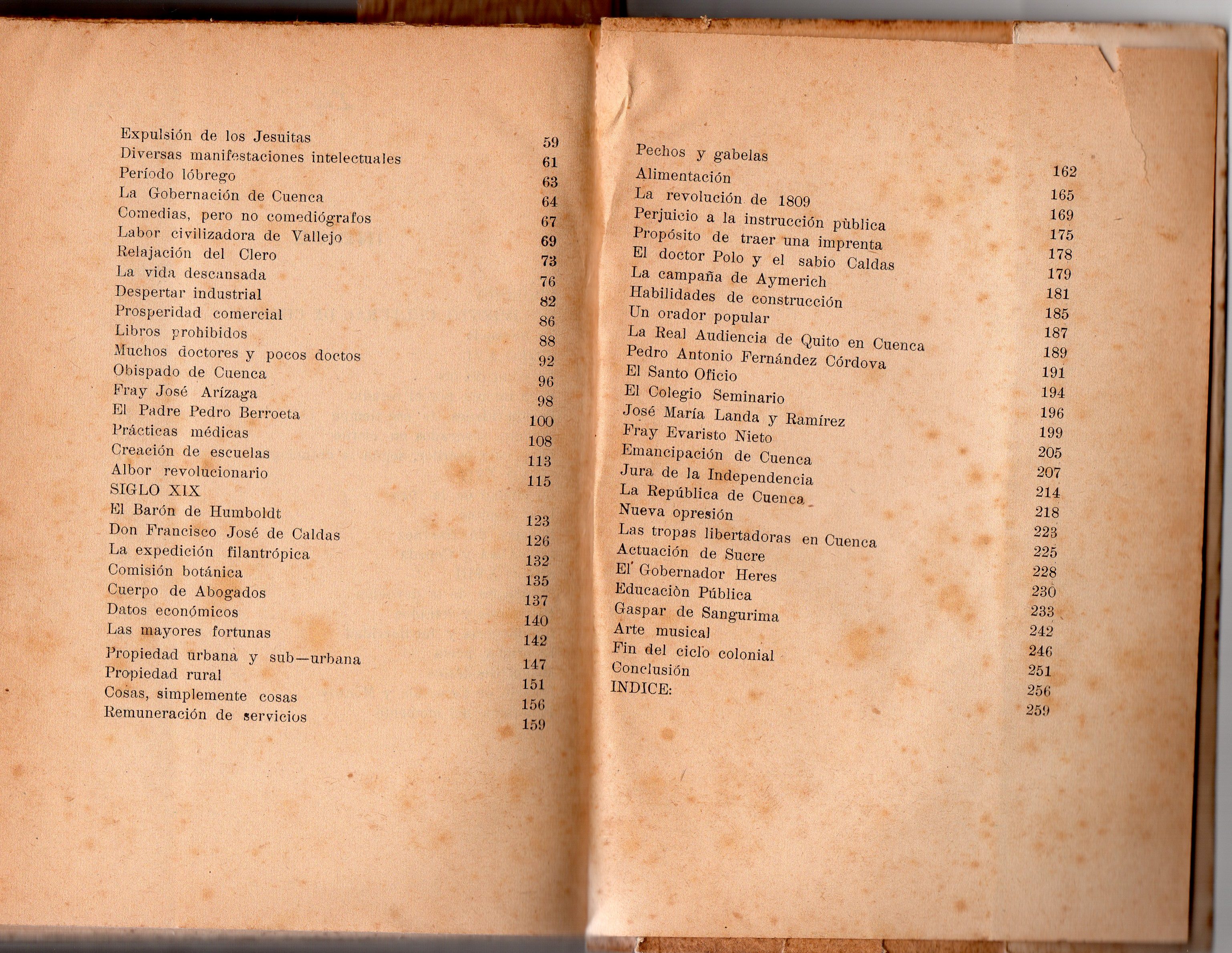 TÃtulo : Movimiento cultural de Cuenca durante la época de la Colonia Tipo de documento: texto impreso Autores: Victor Manuel Albornoz, Autor Número de páginas: 257 p Dimensiones: 19.5x14.5 cm Nota general: Incluye: Indice. Idioma : Español Clasificación: Historia del Ecuador Palabras clave: HISTORIA DE CUENCA, LA COLONIA, EXPULSION DE LOS JESUITAS. Clasificación: 986.6 Ecuador Nota de contenido: Movimiento cultural de Cuenca.-- La nacencia.-- Siglo XVI.-- La edad del oro.-- Poco interés por el estudio.-- Peculiaridades de ese tiempo.-- Ingenios truncados en cierne.-- El primer escritor, según la cronología.-- Siglo XVII.-- La ciudad de la paz.-- Los Jesuitas.-- Rodrigo de Narváez.-- Los Abad y Cepeda.-- Siglo XVIII.-- El acicate de la devoción.-- Misioneros y letrados.-- Ramplonería y mediocridad.-- El primer poeta.-- Misión Geodésica.-- Ignacio de Escandón y Moroy.-- Panorama del momento... Link: https://catalogo.bibliolatino.com/uemo/opac_css/index.php?lvl=notice_display&id= Reserva