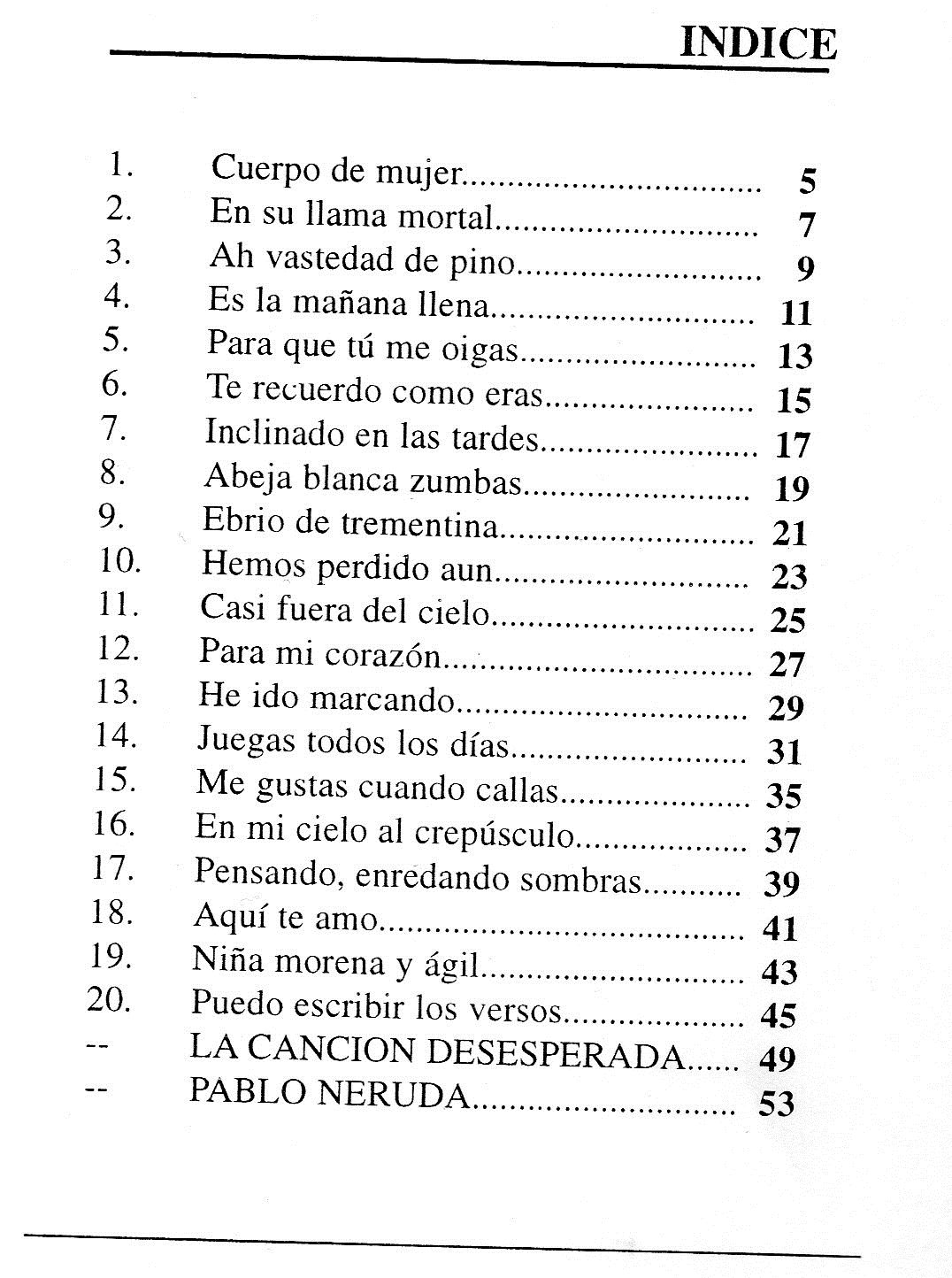 TÃtulo : 20 Poemas de amor y una canción desesperada Tipo de documento: texto impreso Autores: Pablo Neruda, Autor Número de páginas: 54 p. Dimensiones: 15x10.5 cm Nota general: Incluye: Indice. Idioma : Español Clasificación: Literatura Chilena Palabras clave: POESIA. Clasificación: 860.2 NER Link: https://catalogo.bibliolatino.com/uemo/opac_css/index.php?lvl=notice_display&id= Reserva